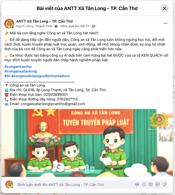 Thời gian qua, Công an xã Tân Long đã chủ động nghiên cứu, ứng dụng trí tuệ nhân tạo (AI) vào công tác tuyên truyền, phổ biến, giáo dục pháp luật, từng bước đổi mới nội dung, hình thức tuyên truyền, phù hợp với yêu cầu chuyển đổi số trong tình hình hiện nay.
