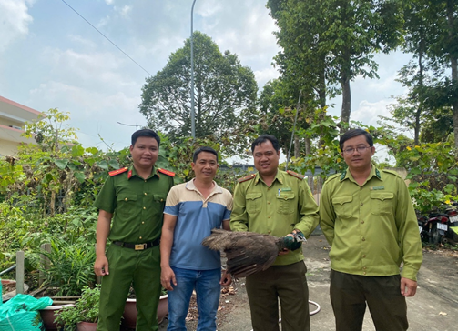 Công an xã Vĩnh Trinh phối hợp bàn giao cá thể chim công cho lực lượng Kiểm lâm thành phố Cần Thơ.