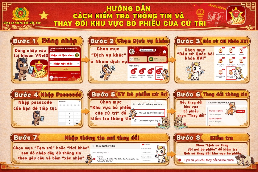 Công an thành phố Cần Thơ đề nghị người dân chủ động cài đặt và sử dụng ứng dụng VNeID, thường xuyên kiểm tra thông tin cử tri của bản thân để tham gia bầu cử đầy đủ, đúng thời gian, đúng địa điểm, góp phần bảo đảm cuộc bầu cử đại biểu Quốc hội diễn ra an toàn, dân chủ, đúng pháp luật./.