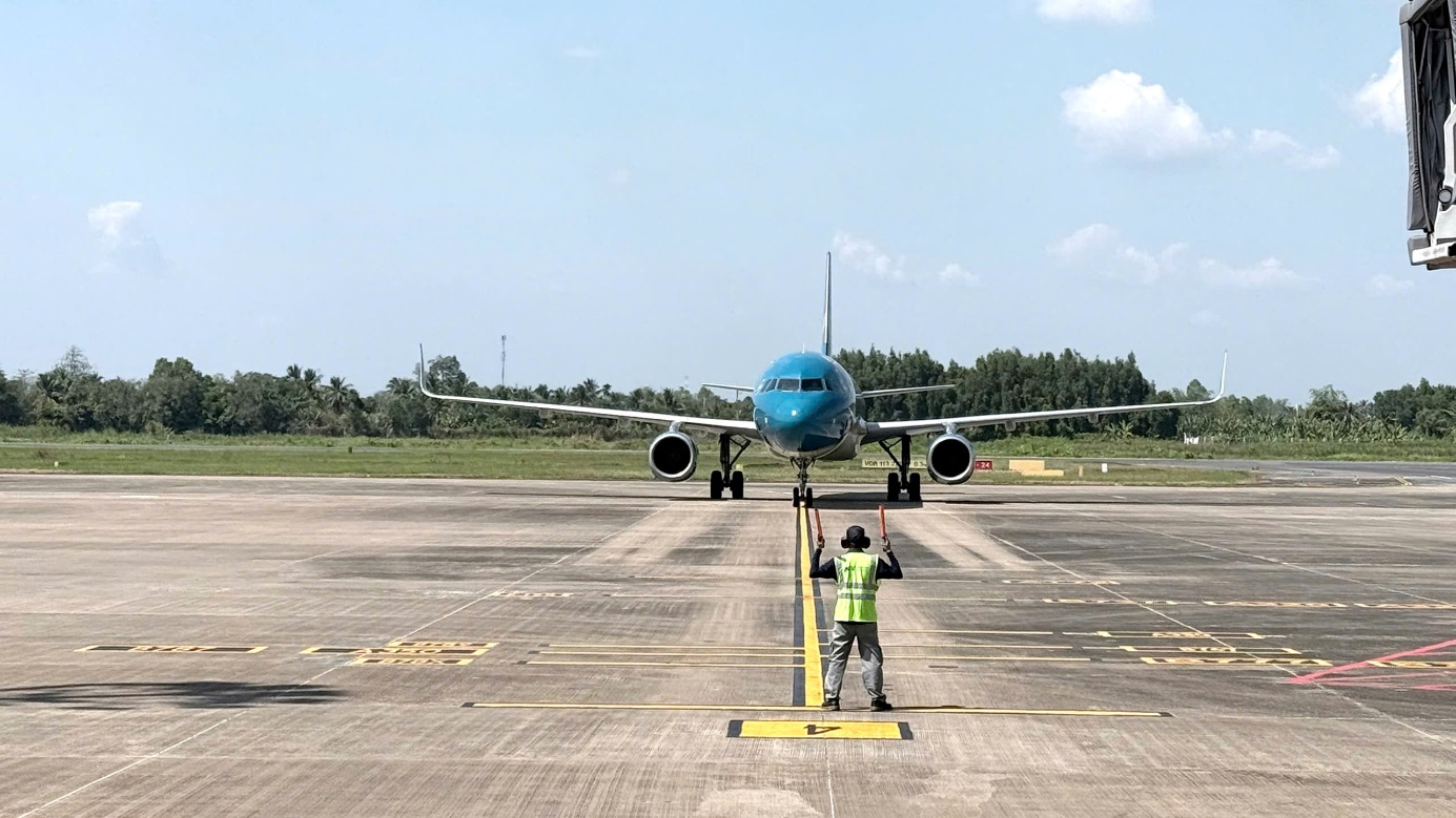 Nhân viên điều phối máy bay đánh tín hiệu đưa Tàu bay vào đúng vị trí đỗ