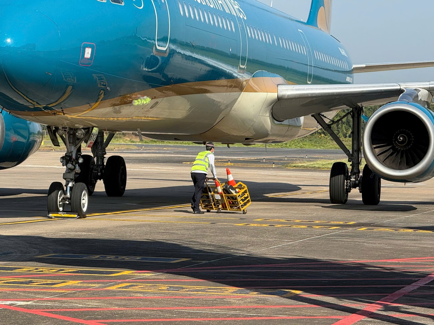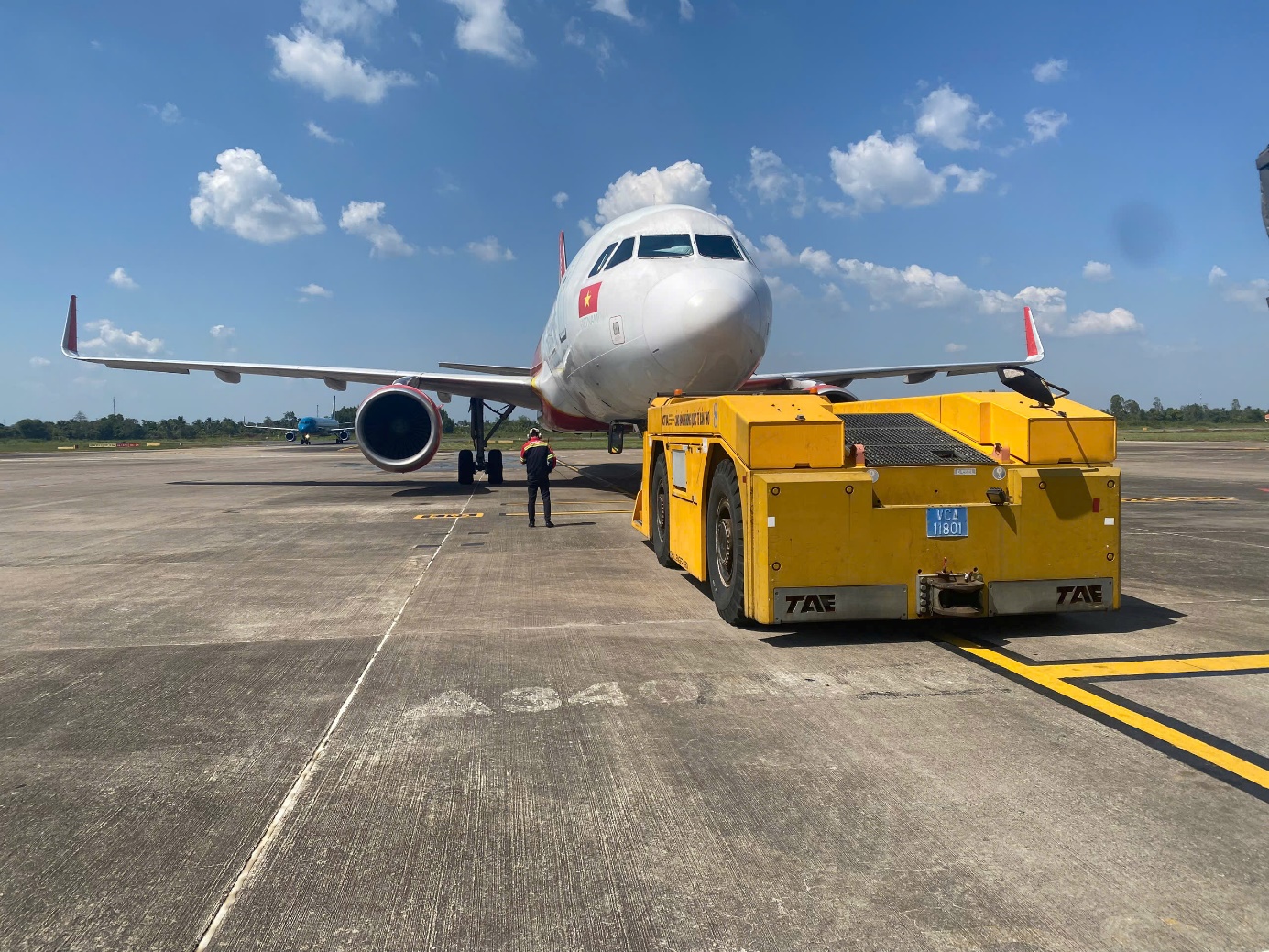 Nhân viên điều khiển xe kéo đẩy Tàu bay ra đường lăn chuẩn bị cất cánh