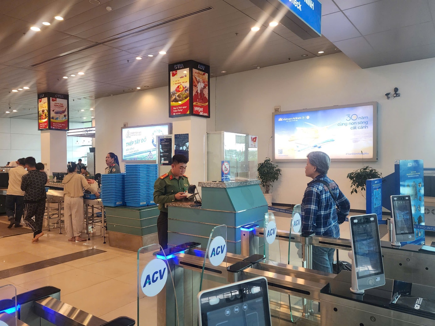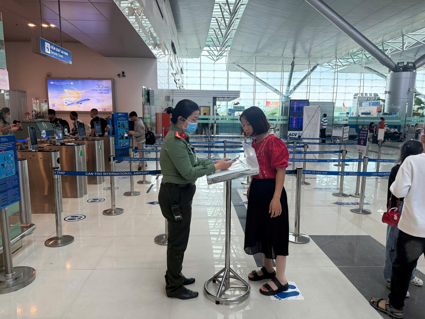 Lực lượng An ninh hàng không kiểm tra giấy tờ tùy thân và hướng dẫn giấy tờ cho hành khách