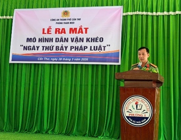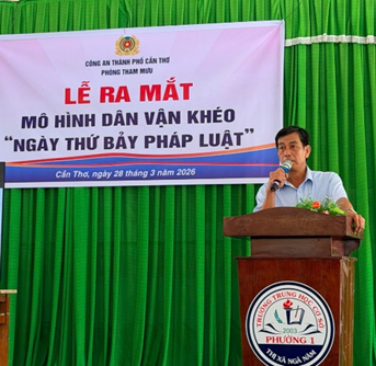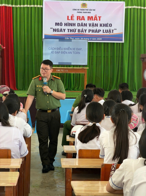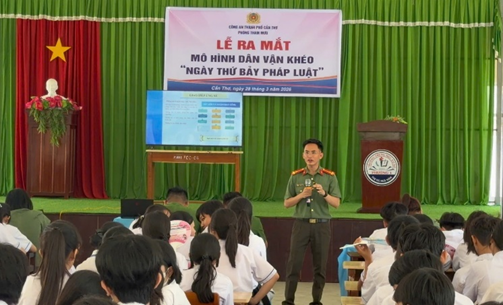 Ngày 28/3/2026, tại Trường Trung học cơ sở phường Ngã Năm (phường Ngã Năm, thành phố Cần Thơ), Phòng Tham mưu Công an thành phố Cần Thơ tổ chức ra mắt mô hình Dân vận khéo “Ngày thứ Bảy pháp luật” thu hút hơn 100 em học sinh tham gia. Hoạt động không chỉ góp phần nâng cao nhận thức, ý thức chấp hành pháp luật trong lứa tuổi học sinh mà còn là công trình thiết thực chào mừng các ngày lễ lớn, gắn chặt với phong trào thi đua “Ba nhất: Kỷ luật nhất - Trung thành nhất - Gần dân nhất” trong lực lượng Công an thành phố. Mô hình “Ngày thứ Bảy pháp luật” ra mắt với mục đích tuyên truyền nâng cao nhận thức, ý thức chấp hành pháp luật trong lứa tuổi học sinh, được triển khai định kỳ hằng quý tại các xã, phường trên địa bàn thành phố, với nội dung thiết thực, phù hợp. Đây là cách làm sáng tạo, thể hiện tinh thần chủ động, trách nhiệm của cán bộ, chiến sĩ Phòng Tham mưu trong công tác dân vận, hướng mạnh về cơ sở, phục vụ Nhân dân, đặc biệt là thế hệ trẻ.