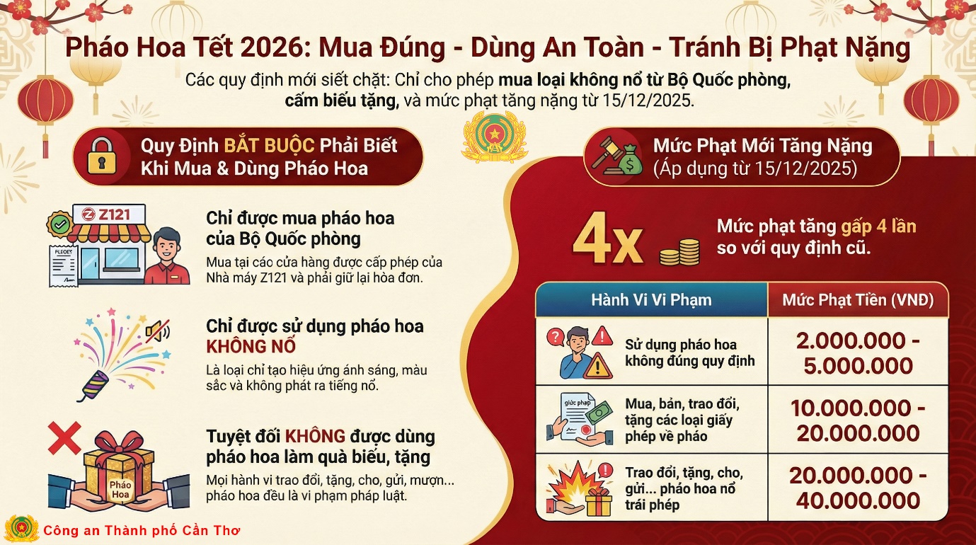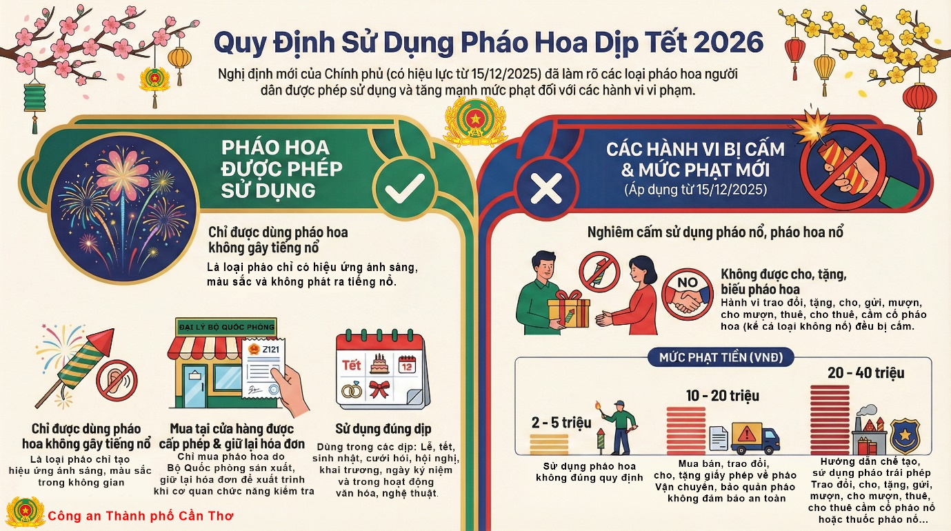 Nhằm bảo đảm an ninh, trật tự, an toàn xã hội trong dịp Tết Nguyên đán 2026, Công an thành phố Cần Thơ thông tin, khuyến cáo người dân thực hiện nghiêm các quy định của pháp luật về quản lý, sử dụng pháo theo Nghị định số 137/2020/NĐ-CP (sửa đổi, bổ sung bởi Nghị định số 56/2023/NĐ-CP) và Nghị định số 282/2025/NĐ-CP của Chính phủ, có hiệu lực từ ngày 15/12/2025.
