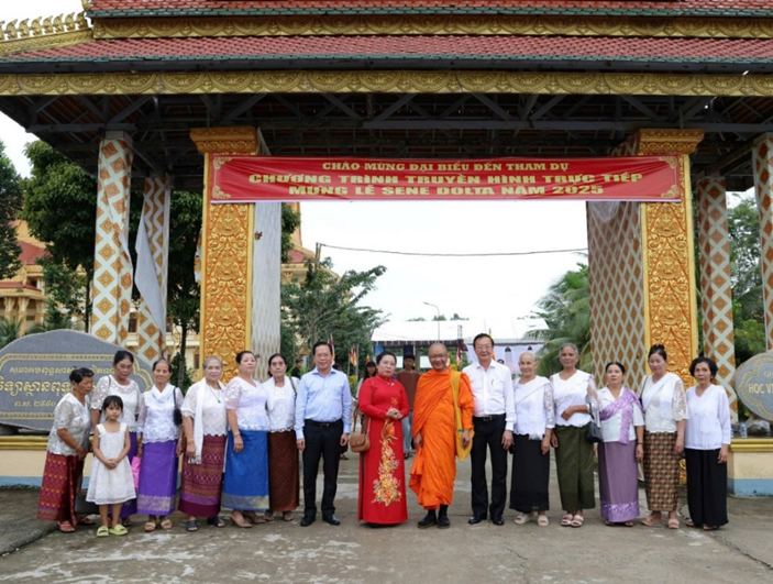 Đồng chí Hồ Thị Cẩm Đào, Phó Bí thư Thành ủy, Chủ tịch Ủy ban MTTQ Việt Nam thành phố Cần Thơ chúc mừng Lễ Sene Đônta năm 2025 tại Học viên Phật giáo Nam tông Khmer