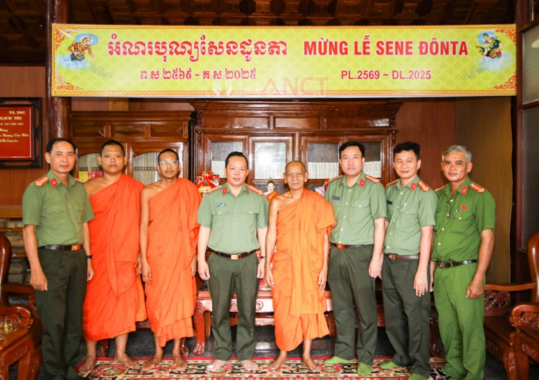 Đại tá Nguyễn Văn Thắng - Phó Giám đốc Công an thành phố Cần Thơ (thứ tư từ trái sang) thăm, chúc mừng Hòa thượng Đào Như - Phó Chủ tịch Hội đồng Trị sự Trung ương Giáo hội Phật giáo Việt Nam, Viện trưởng Học viện Phật giáo Nam tông Khmer, Trưởng Ban Trị sự Giáo hội Phật giáo Việt Nam thành phố Cần Thơ nhân dịp Lễ Sene Đônta năm 2025 tại Chùa Pôthi Sômron