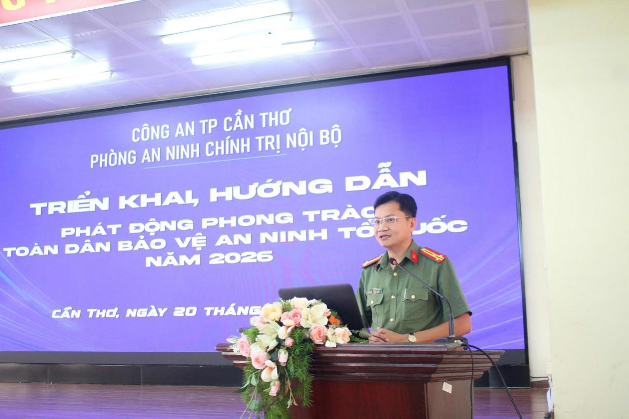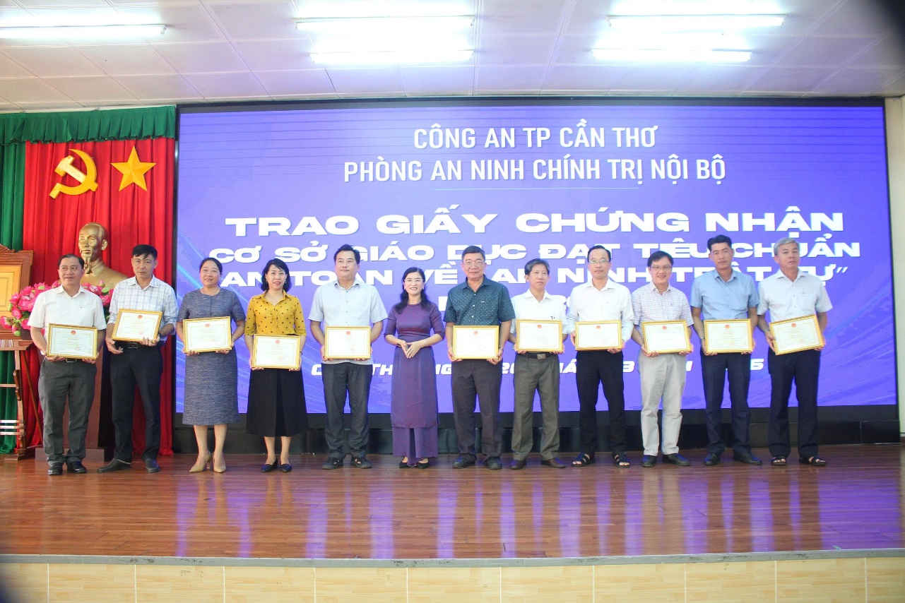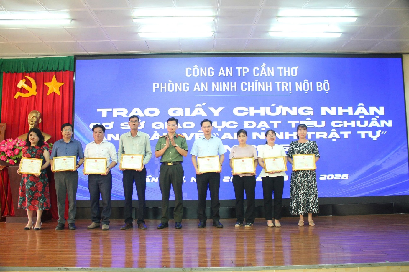 Tại buổi triển khai, hướng dẫn phát động phong trào toàn dân bảo vệ an ninh Tổ quốc năm 2026, Phòng An ninh chính trị nội bộ đã tổ chức triển khai những nội dung cốt lõi trong công tác xây dựng phong trào toàn dân bảo vệ an ninh Tổ quốc; triển khai các chủ trương, đường lối của Đảng, chính sách, pháp luật của Nhà nước, các quy định, chương trình, kế hoạch của Bộ Công an và Ủy ban nhân dân thành phố Cần Thơ về công tác đảm bảo an ninh, trật tự và xây dựng phong trào toàn dân bảo vệ an ninh Tổ quốc (bao gồm: Chỉ thị số 09-CT/TW ngày 01/12/2011 của Ban Bí thư về “Tăng cường sự lãnh đạo của Đảng đối với phong trào toàn dân bảo vệ an ninh Tổ quốc trong tình hình mới”; Chỉ thị số 06/CT-BCA-V05 ngày 07/5/2025 của Bộ Công an về nâng cao chất lượng, hiệu quả phong trào toàn dan bảo vệ an ninh Tổ quốc trong cơ quan, doanh nghiệp, cơ sở giáo dục đáp ứng yếu cầu, nhiệm vụ bảo đảm an ninh, trật tự trong tình hình mới; Thông tư số 124/2021/TT-BCA ngày 28/12/2021 của Bộ Công an quy định khu dân cư, xã phường, thị trấn, cơ quan, doanh nghiệp, cơ sở giáo dục đạt tiêu chuẩn “An toàn về an ninh, trật tự”, được sửa đổi, bổ sung bởi Thông tư số 48/2025/TT-BCA ngày 26/7/2025 của Bộ Công an; Kế hoạch số 81/KH-UBND ngày 22/9/2025 của Ủy ban nhân dân thành phố Cần Thơ về tiếp tục xây dựng khóm, ấp, khu vực, xã, phường, cơ quan, doanh nghiệp, cơ sở giáo dục đạt tiêu chuẩn “An toàn về an ninh, trật tự” trên địa bàn thành phố Cần Thơ; Quyết định số 510/QĐ-BCA-V05 ngày 20/01/2022 của Bộ Công an ban hành “Quy định Tiêu chí đánh giá, phân loại phong trào toàn dân bảo vệ an ninh Tổ quốc”; Kế hoạch số 70/KH-UBND ngày 11/02/2026 của Ủy ban nhân dân thành phố Cần Thơ về xây dựng xã, phường, thị trấn, cơ quan, doanh nghiệp, cơ sở giáo dục điển hình về phong trào toàn dân bảo vệ ANTQ trên địa bàn thành phố Cần Thơ...). Theo đó, xác định công tác đảm bảo an ninh, trật tự tại các cơ sở giáo dục và xây dựng phong trào toàn dân bảo vệ an ninh Tổ quốc là nhiệm vụ thường xuyên của cấp ủy, lãnh đạo các cơ sở giáo dục; trong đó lực lượng Công an giữ vai trò nòng cốt trong tham mưu, hướng dẫn thực hiện. Đồng thời, tổ chức hướng dẫn các cơ sở giáo dục phối hợp cơ quan Công an trong xây dựng và thực hiện mô hình dân vận khéo về công tác đảm bảo an ninh, trật tự tại cơ sở giáo dục và phong trào toàn dân bảo vệ an ninh Tổ quốc; đăng ký thực hiện cơ sở giáo dục điển hình về phong trào toàn dân bảo vệ an ninh Tổ quốc và các biện pháp nhằm nâng cao chất lượng, hiệu quả phong trào toàn dân bảo vệ an ninh Tổ quốc phù hợp với thực tiễn đặc điểm, tình hình tại mỗi cơ sở giáo dục. Tại buổi triển khai, hướng dẫn Phòng An ninh chính trị nội bộ đã trao 76 cơ sở giáo dục đạt tiêu chuẩn “An toàn về an ninh, trật tự” năm 2025 theo Quyết định số 220/QĐ-UBND ngày 16/01/2026 của Chủ tịch Ủy ban nhân dân thành phố về việc công nhận các xã, phường, cơ quan, doanh nghiệp đạt tiêu chuẩn “An toàn về an ninh, trật tự” năm 2025.