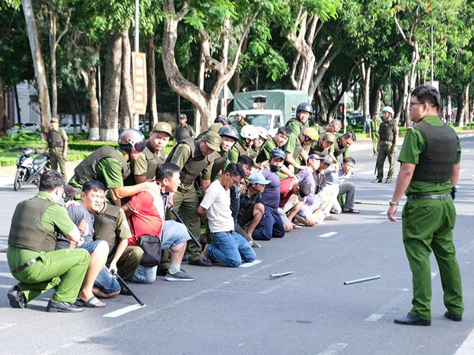 Ảnh: Lực lượng tham gia bảo vệ ANTT ở cơ sở TP Cần Thơ diễn tập thực binh phối hợp xử lý tình huống nhóm đối tượng tụ tập đông người đánh nhau.