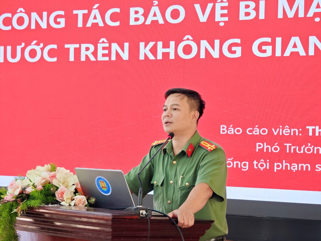 Các đại biểu tham dự Hội nghị tập huấn đã được đồng chí Thượng tá Trịnh Đức Nhỏ, Trưởng phòng An ninh chính trị nội bộ triển khai tập huấn chuyên sâu về các nội dung gồm: Luật Bảo vệ bí mật nhà nước 2025 (có hiệu lực thi hành từ ngày 01/3/2026), Nghị định số 63/2026/NĐ-CP ngày 28/02/2026 quy định chi tiết một số điều và các biện pháp thi hành Luật Bảo vệ bí mật nhà nước và các văn bản hướng dẫn thi hành công tác bảo vệ bí mật nhà nước; hướng dẫn quy trình thực hiện công tác bảo vệ bí mật nhà nước; nhận diện những sơ hở, hạn chế trong thực hiện nhiệm vụ bảo vệ bí mật nhà nước trong thời gian qua; phổ biến các quy định của Đảng, pháp luật của Nhà nước về xử lý vi phạm liên quan. Đồng thời, được đồng chí Thượng tá Phan Sỹ Vinh, Phó Trưởng phòng An ninh mạng và phòng, chống tội phạm sử dụng công nghệ cao triển khai Luật An ninh mạng 2025; các biện pháp đảm bảo bí mật nhà nước trên không gian mạng, đảm bảo an toàn thông tin; hướng dẫn biện pháp tăng cường bảo đảm an toàn thông tin trong bối cảnh thực hiện công tác chuyển đổi số hiện nay.