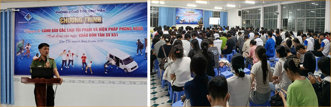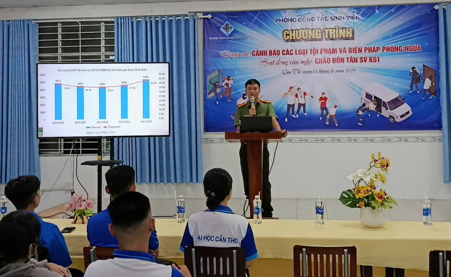 Ngày 04/10/2025, Phòng An ninh chính trị nội bộ, Công an thành phố Cần Thơ phối hợp Phòng Công tác sinh viên, Đại học Cần Thơ tổ chức Chương trình tuyên truyền, cảnh báo các loại tội phạm và biện pháp phòng ngừa cho khoảng 200 em tân sinh viên nội trú tại Ký túc xá Đại học Cần Thơ. Nội dung tuyên truyền về những hành vi vi phạm pháp luật chủ yếu trong sinh viên thời gian gần đây; phương thức, thủ đoạn hoạt động của các loại tội phạm lợi dụng mạng internet và mạng xã hội để lừa đảo nhằm chiếm đoạt tài sản của người dân, nhất là trong sinh viên; hoạt động của các thế lực thù địch, phần tử xấu đăng tải các nội dung tin giả, tin xấu độc liên quan đến hoạt động lợi dụng biểu tình, bạo loạn tại một số quốc gia để tiến hành hoạt động xâm phạm an ninh quốc gia tại Việt Nam.