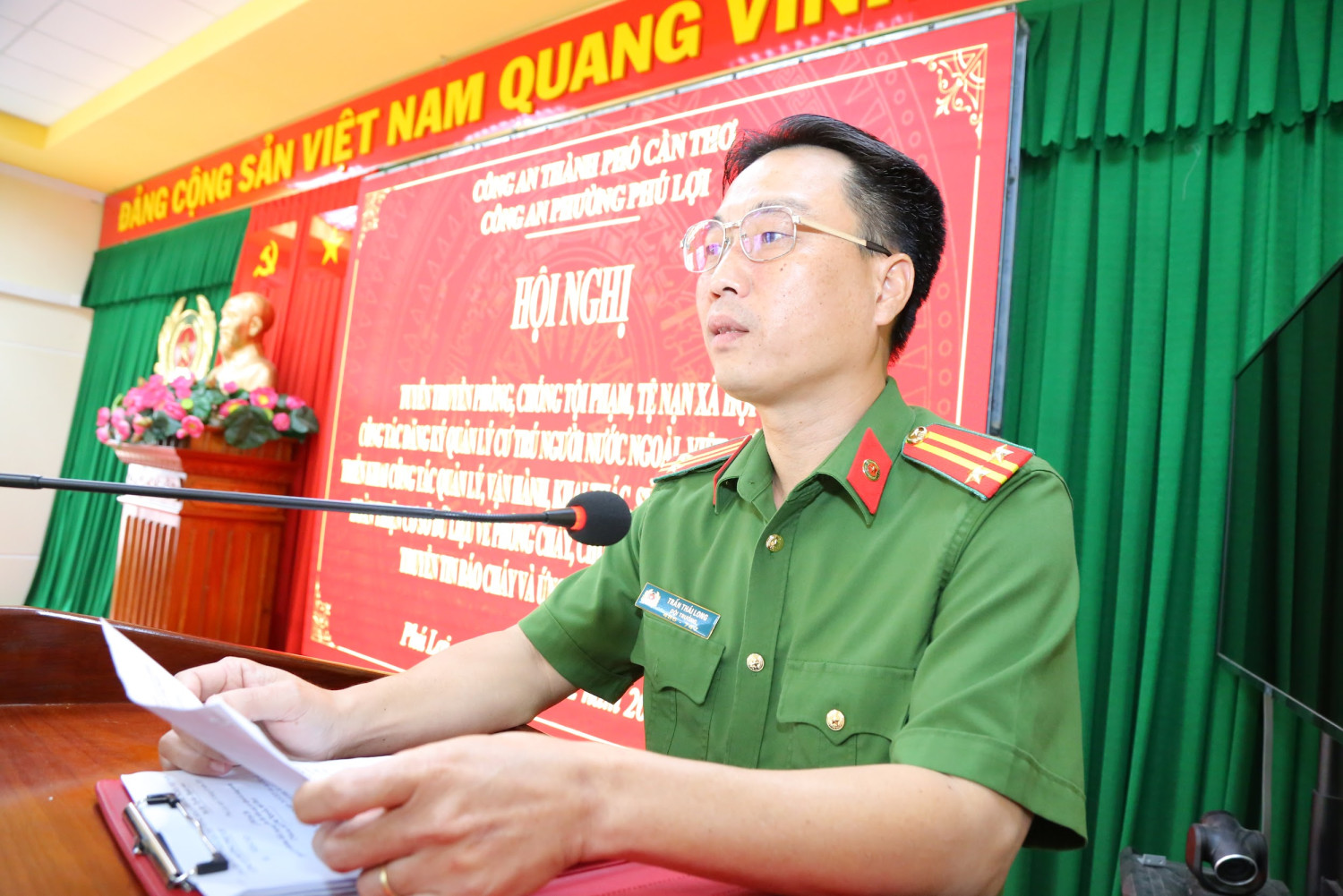 Trung tá Trần Thái Long, Trưởng Công an phường phát biểu tại hội nghị tuyên truyền